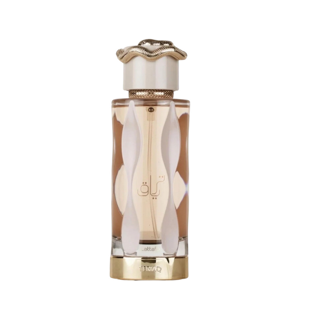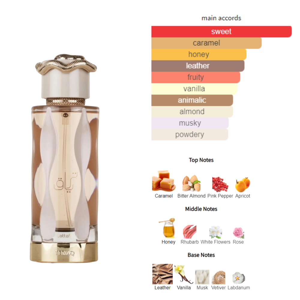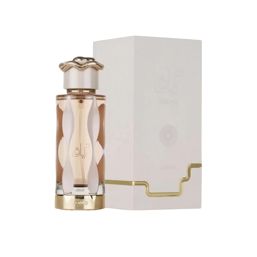 Teriaq by Lattafa Perfumes is a fragrance for women and men. This is a new fragrance. Teriaq was launched in 2024. The nose behind this fragrance is Quentin Bisch. Top notes are Pink Pepper, Caramel, Bitter Almond and Apricot; middle notes are Honey, White Flowers, Rhubarb and Rose; base notes are Vanilla, Leather, Labdanum, Musk and Vetiver.