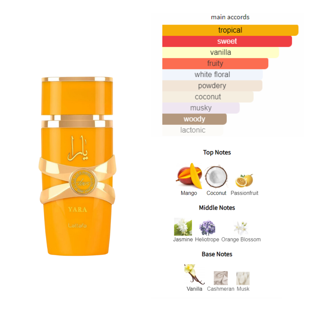 Yara Tous by Lattafa Perfumes is a fragrance for women. This is a new fragrance. Yara Tous was launched in 2023. Top notes are Mango, Coconut and Passionfruit; middle notes are Jasmine, Heliotrope and Orange Blossom; base notes are Vanilla, Musk and Cashmeran.